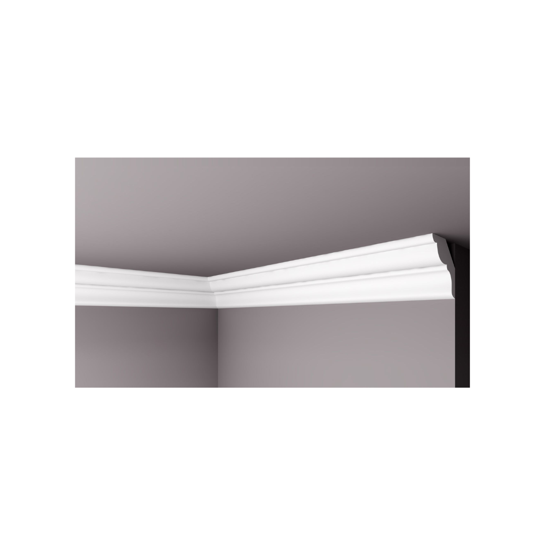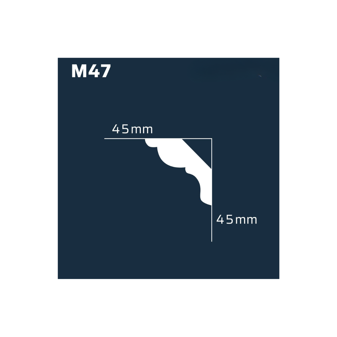 La moldura M47 se caracteriza por su suavidad y elegancia, combinando simplicidad y sofisticación. Su perfil curvado facilita una transición armoniosa entre el techo y la pared, generando un ambiente acogedor.